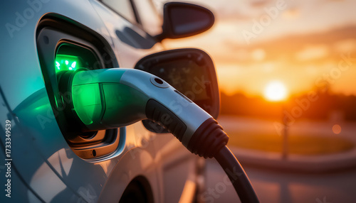 An EV charger is plugged into a car at sunset, highlighting the vibrant green LED light.