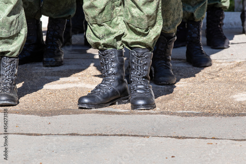 An even row of military boots in formation of military personnel Legs of military personnel in military boots. Topic: army, military uniform