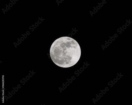 An excellent, clear photograph of a bright full moon against a completely dark night sky
