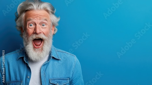 An excited older man expresses pure joy with an open mouth smile, radiating happiness and playfulness, perfectly highlighted against a vivid blue backdrop.