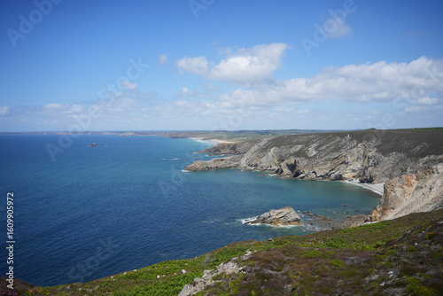 An expansive view of the green, rolling headlands of the Brittany coast under a sky with scattered clouds.