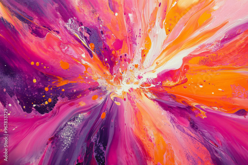 explosion, vibrant, paint, shades, pink, orange, purple, bursting, outward, dynamic, splash, glossy, high, shine, finish