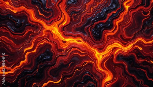 An explosive abstract pattern of fiery colors—red, orange, and yellow—twisting and intertwining like flames, with dark charred black elements, creating a dynamic and intense visual effect