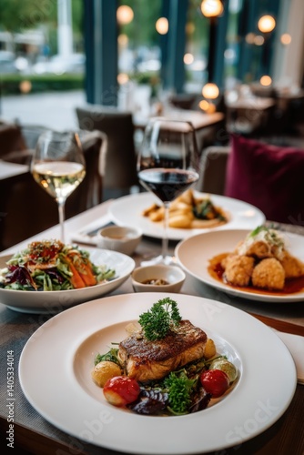 An exquisite high-quality photo depicting a dining atmosphere with a variety of dishes, including appetizers and main courses, situated in Berlin's Kurfürstendamm, ideal for lunch or dinner.
