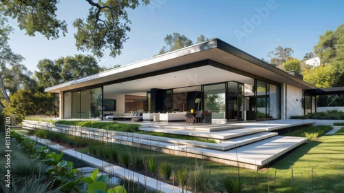 An exterior view of a minimalist-style house with flat rooflines, clean facade, and landscaped garden, showcasing contemporary architectural design.