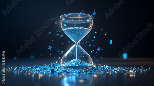 An hourglass with digital pixels spilling like sand, symbolizing the passing of time in the digital era and the accumulation of electronic waste