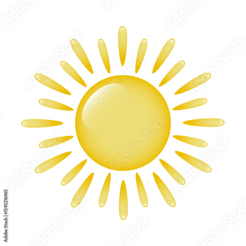 An icon of a large, cartoon sun with rays on a white background. A three-dimensional sun with glare and rays. Logo, sun sticker. The concept of summer and weather. Vector EPS 10.