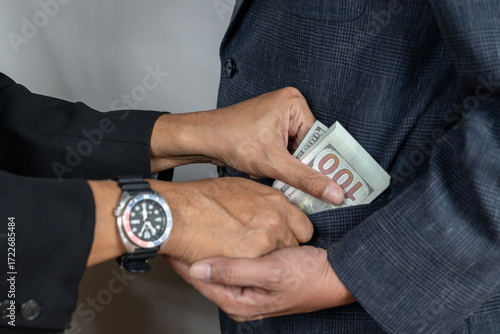 An illicit transaction taking place between two business professionals. One man is discreetly slipping a wad of cash into the inner pocket of another person's suit, symbolizing bribery and unethical b