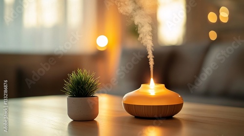 aroma, diffuser, essential, oil, steam, light, glow, smoke, lamp, candle, cosy, warm, relaxation, home, indoor, plant, green, pot, table, surface, wood, natural, healthy, wellness, therapy, air, purification, calm, serenity, atmosphere, interior, decor, design, modern, living, space, soft, blurry, background, shape, sharpened, closeup, small, minimalist, soothing, vapour, scent