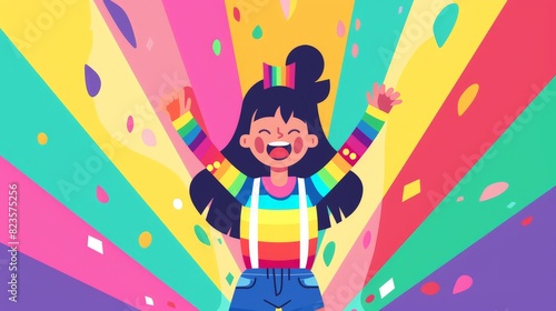 illustration, flat, style, character, celebrate, queer, pride, outfit, flag, background, minimalistic, focusing, joyful, expression