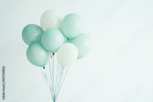 An illustration of a bouquet of balloons in light blue and green, against a white background.