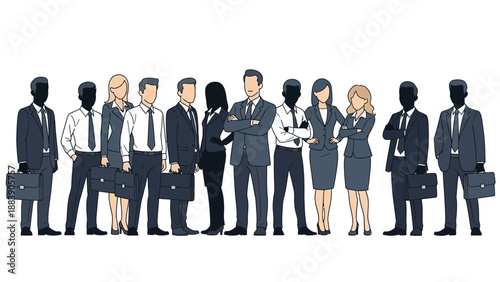 people, business, professional, team, group, corporate, office, work, employee, staff, manpower, man, woman, diverse, standing, suit, formal, attire, colleague, partnership, collaboration, management, leadership, executive, company, organisation, enterprise, career, success, meeting, conference, illustration, vector, graphic, white, background, isolated, full, length, adult, confident, serious, smart, elegant, professional, successful, entrepreneur, manager, director