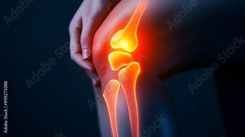 An illustration of a human knee joint highlighting the bone structure and possible pain areas, ideal for medical and health content.