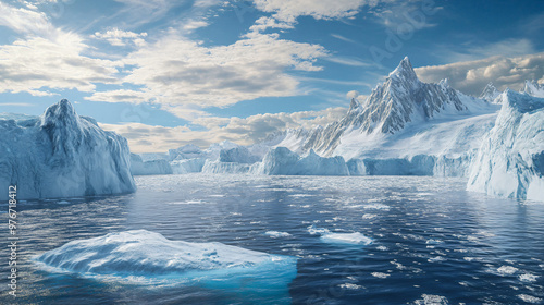 An illustration of the melting ice caps with rising sea levels and submerged coastal areas.