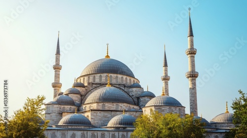 architecture, mosque, building, dome, minaret, structure, religion, islamic, travel, culture, heritage, stone, facades, sky, blue, ornate, pattern, design, detail, tower, church steeple, gold, symmetry, historical building, historical, landmark, exterior, spiritual, belief, worship, sanctuary, construction, complex, roof, top, elevation, perspective, ancient, classical, decorative, light, sunshine, tree, plant, greenery, outside, view