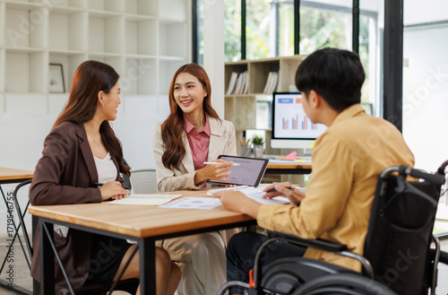 inclusion, team, environment, office, workplace, wheelchair, innovation, business, happy, modern, strategy, professional, casual attire, mobility, technology, corporate, smile, creative, meeting, teamwork, young, adult, support, working, employment, motivation, engagement, conversation, discussion, productivity, diversity, positive, collaboration, dynamic, multicultural, accessibility, empowerment, assistance, colleague, co-worker, inclusive, interact, planning, professionalism