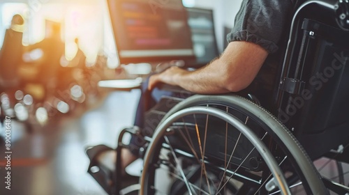 An inclusive remote work environment where a person with a disability uses assistive technology to manage data on a computer Stock Photo with copy space