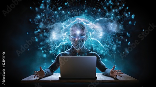 person, connected, computer, energy, interface, task, computing, generative, ai, technology, neuroscience, futuristic, science, artificial intelligence, biotechnology, innovation, science fiction, research, breakthrough, mind, cyber, laptop, business, businessman, notebook, cyberspace, people, office, working, work, keyboard, sitting, communication, hand, typing, screen, suit, man, network, floor, monitor, manager