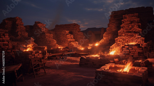 an industrial brick kiln, lit by the glow of burning firewood, with stacks of bricks ready for firing