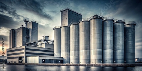 industrial complex, silos, cylindrical, tall, cloudy sky, still water, canal, grey, concrete, industrial, building, structure, factory, manufacturing, storage, production, water, sky, cloud, metal, architecture, design, engineering, infrastructure