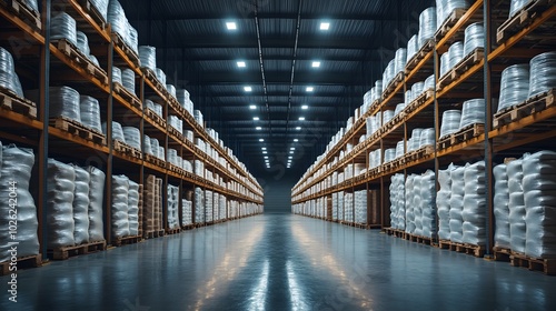 An industrial warehouse filled with stacks of fertilizer bags on wooden pallets, featuring long aisles and high shelving units, capturing the essence of agricultural supply storage.