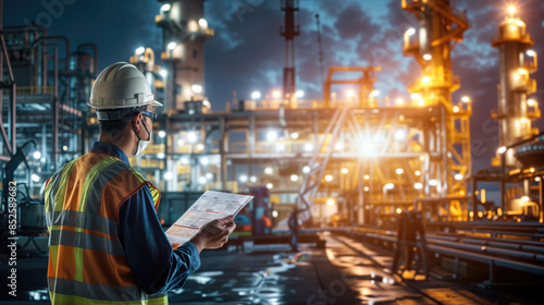 An industrial worker in a hard hat and safety vest examines documents at a brightly lit oil refinery at night.