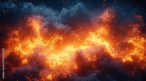 An inferno of fire and smoke represents danger, destruction, and burning energy, creating an abstract explosion.