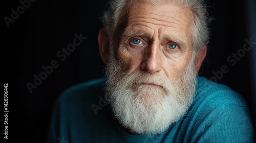 An intense elderly man with a grey beard and captivating blue eyes stares directly into the lens, showcasing a blend of wisdom and emotional depth that engages the viewer.