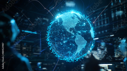 An interactive educational experience with a blue hologram globe, glowing data streams, and a world map representing AI-driven global networks.