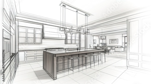 An interior design concept sketch of a modern kitchen with an island and dining table