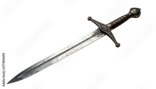 sword, weapon, blade, steel, metal, antique, vintage, mediaeval, renaissance, knight, war, fight, battle, handle, grip, ornate, detailed, intricate, decoration, pattern, design, history, historical, artifact, relic, culture, tradition, sharp, edge, warrior, strength, power, victory, defense, protection, combat, armament, equipment, museum, display, art, craftsmanship, skill, polished, glistening, dark, light, shadow