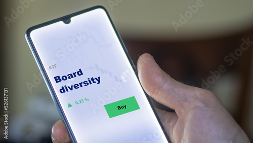 An investor's analyzing the board diversity etf fund on screen. A phone shows the ETF's prices stocks to invest