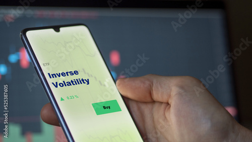 An investor's analyzing the inverse volatility etf fund on screen. A phone shows the ETF's prices stocks to invest
