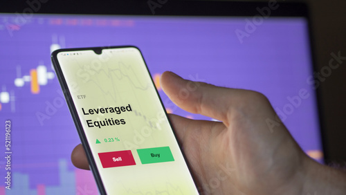 An investor's analyzing the leveraged equities etf leverage fund on a screen to invest. A phone shows the prices of leverage, leveraged-equities ETF