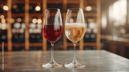 An inviting image of two wine glasses on a sleek countertop, one filled with bubbly champagne and the other with rich red wine, under warm ambient lighting.