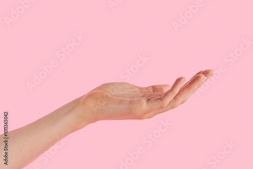 An inviting open hand against a soft pink backdrop offering a sense of calm and connection in a minimalist setting