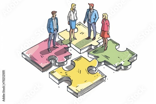 An isometric handdrawn sketch of business people standing on puzzle pieces, symbolizing the merging and blending between team members Generative AI