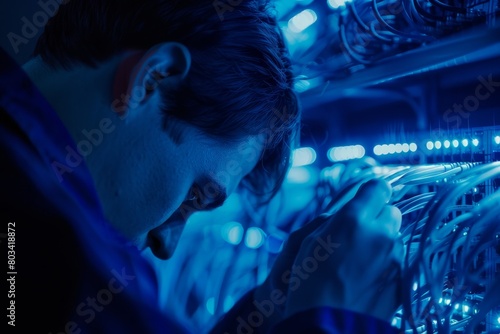 an IT technician is depicted working on network cables in an office environment. The scene is bathed in blue hues with focused lighting