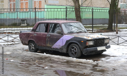 abandoned, aged, auto, automobile, car, city, classic, day, design, ice, machine, old, puddle, russia, russian, rust-eaten, soviet, street, style, thaw, transport, transportation, vehicle, water, winter