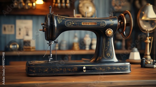 An old sewing machine perches on a wooden table, evoking nostalgia with each thread.