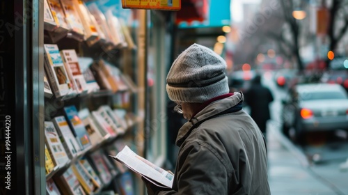 newsstand, reading, city, winter, mag, street, publication, cold, coat, beanie, urban, sidewalk, newspaper, sharpened, downtown, tied-up, pedestrian, casual attire, overcast, city landscape, cognition, commuting, urban life, information, culture, concentration, streetlife, morning, literature, corner store, routine, reader, seasonal