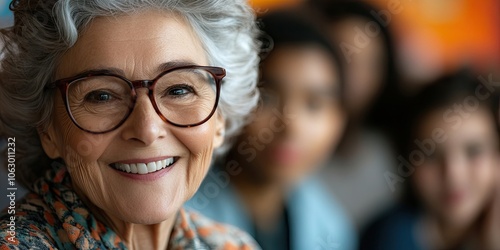 An older woman, wearing glasses and smiling, is part of a group of youthful individuals engaged in a conference call in an office setting.