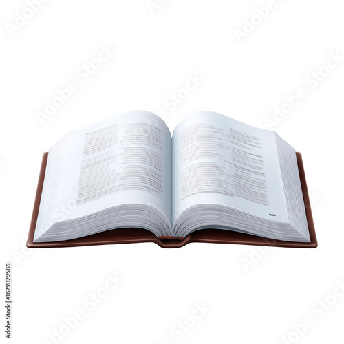 An open book showcasing its pages with lined text, placed on a white isolated background, perfect for learning and reading themes.