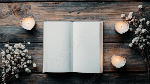 An open book surrounded by fresh flowers and candles, creating a serene ambiance for relaxation and inspiration.