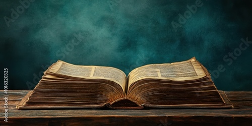 An open book with aged pages, resting on a wooden surface, illuminated by soft light against a textured teal background.