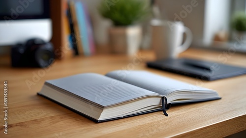 An open notebook with a bookmark rests on a wooden desk with office supplies blurred in the background