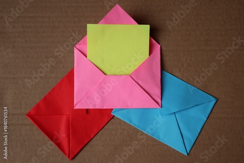 an open pink envelope on top of a stack of colorful envelopes with a cardboard background