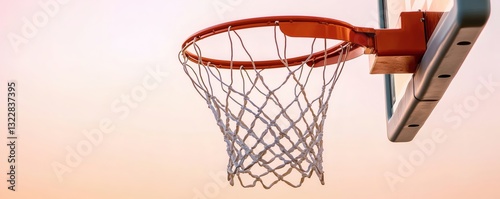 sport, basketball, hoop, net, orange, white, equipment, game, play, competition, rim, backboard, training, court, ball, recreation, exercise, activity, structure, wood, plastic, metal, construction, view, close, sky, sunlight, abstract, perspective, goal, aiming, challenge, success, practice, leisure, empty, texture, shape, angle, modern, detail, simple, design, pattern, background, light, sharpened