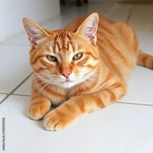 cat, ginger, striped, orange, relaxed, felino, animal, pet, domestic, floor, white, pattern, lounge, cute, fur, whisker, mammal, adorable, cosy, resting, calm, peaceful, soft, fluffy, sleepy, playful, sitting, lying, indoor, home, companion, friendly, content, lazy, warm, gentle, curious, tail, ear, eye, nose, paw, claw, purr, nap, serenity, harmony, tranquil, comfort