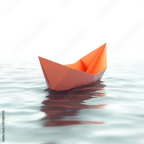 An orange paper boat floats peacefully on calm water, reflecting soft light in a minimalistic and serene setting.